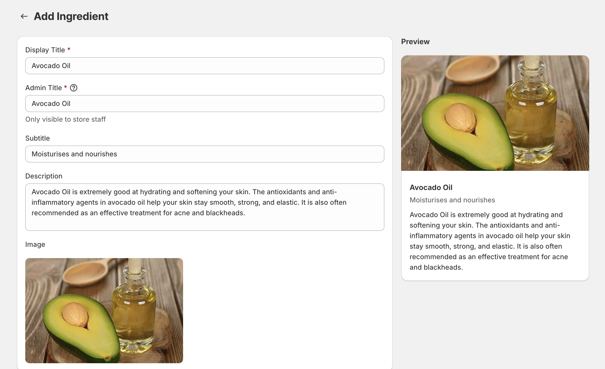 - Admin Title (required) — This is for your reference only and won’t be shown to customers. Use something descriptive like “Shea Butter” or “Vitamin C”.