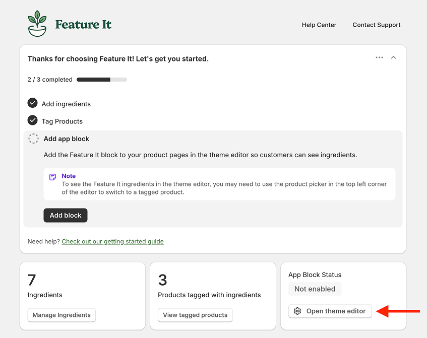 This is the step that makes ingredients visible to your customers. Feature It works through a Shopify theme app block, which you need to add to your product page template once.