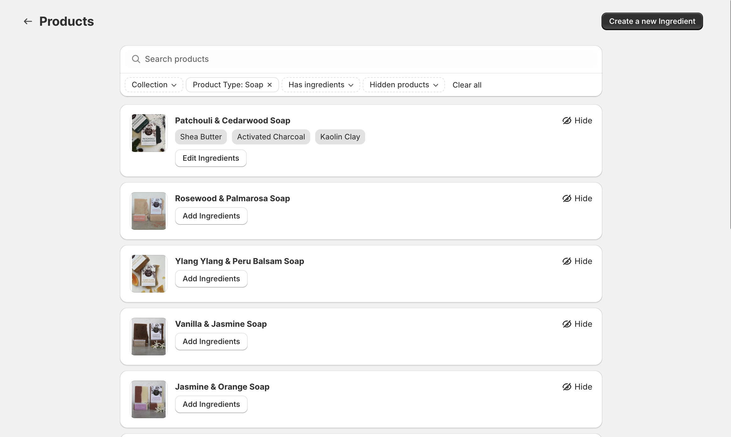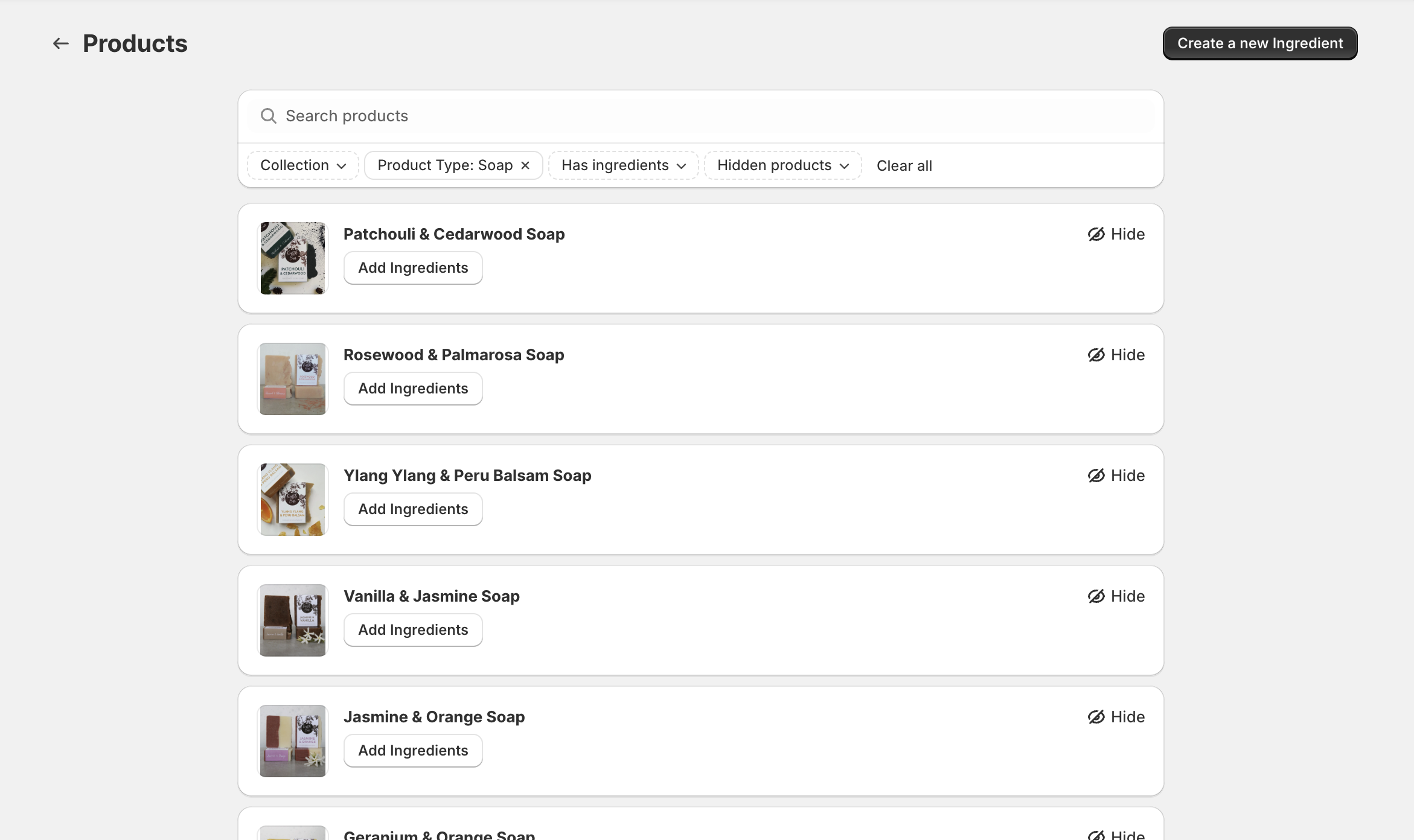 Repeat this step for each ingredient you want to use. Don’t worry about getting everything perfect — any edits you make later will automatically update across all products using that ingredient.