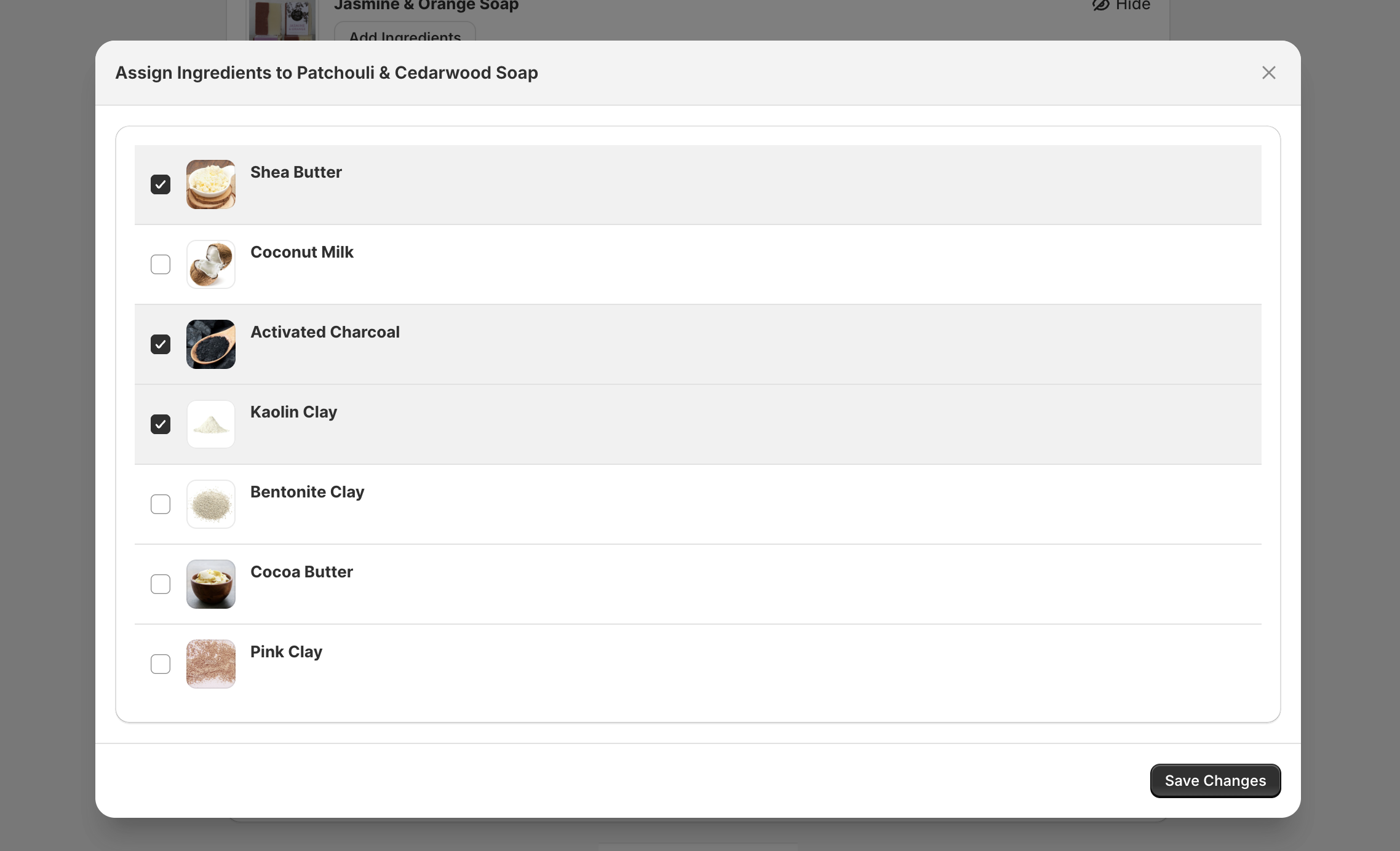 Find the product you want to add ingredients to and click Add Ingredients. A modal will open showing your full ingredient library. Select one or more ingredients and click Save Changes.