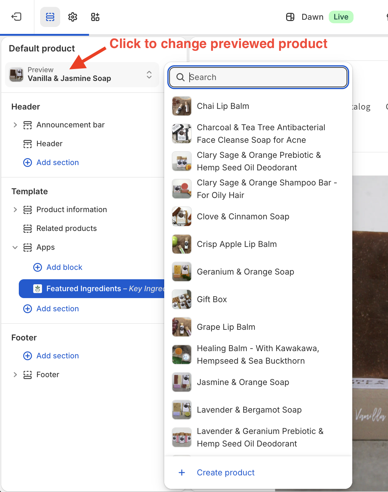 If so you can change the product previewed by clicking on the Product dropdown in the top left corner and selecting a different product. Select a product that you have ingredients assigned to.
