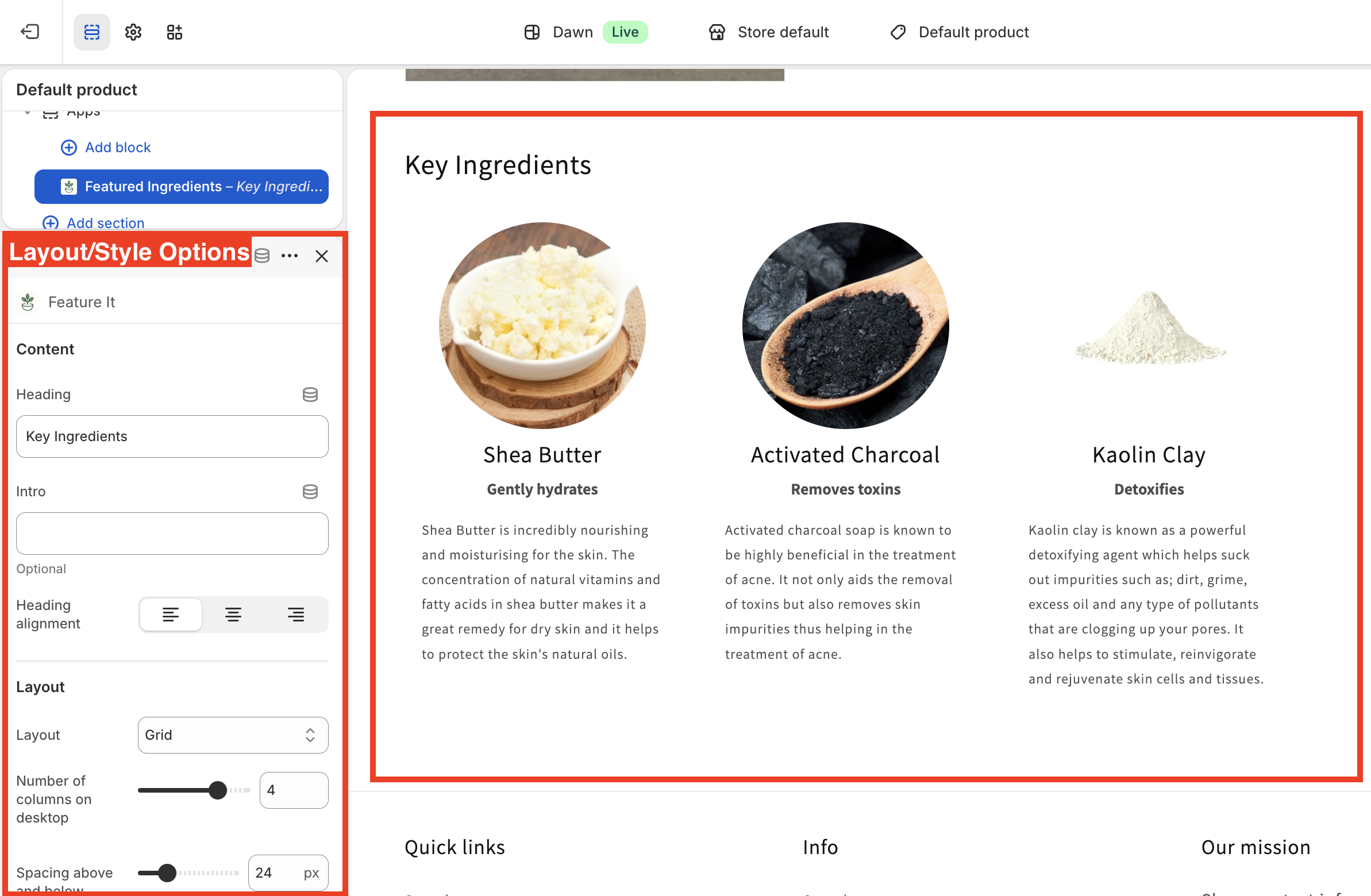 Visit one of your products on the storefront. You should see the ingredients displayed in the position you placed the block.